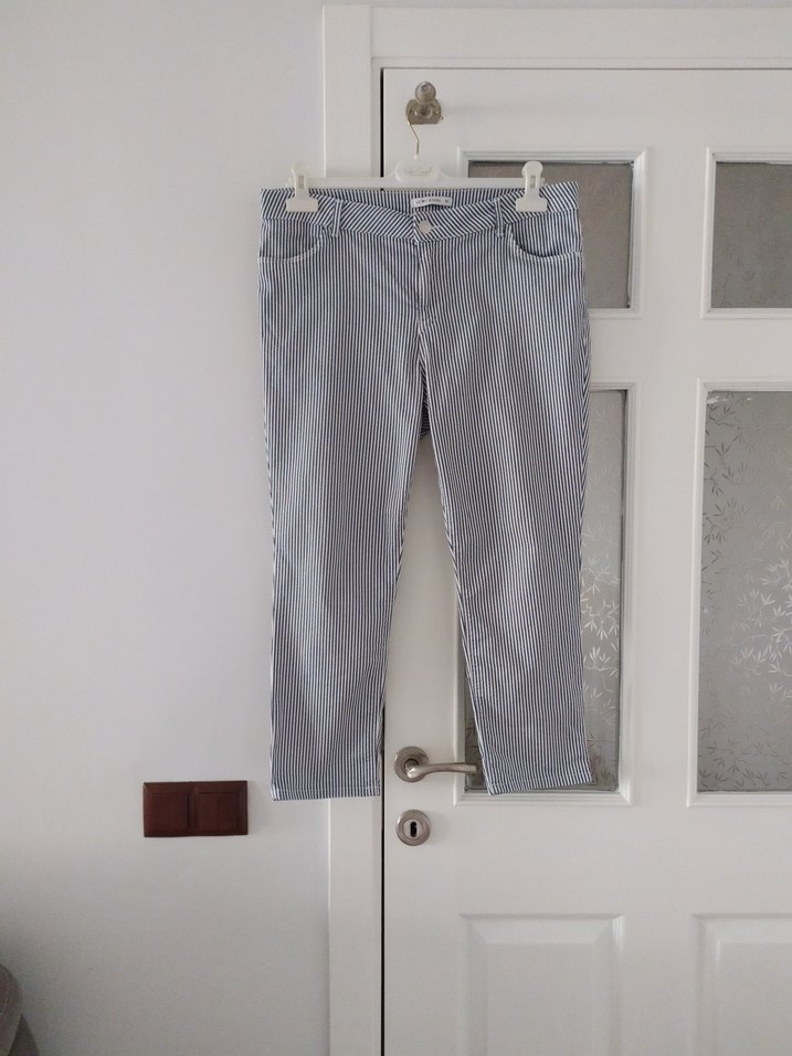 LCW Casual marka, Gri çizgili, regular fit midi uzunluğunda denim kadın pantolon. Tokalı detayıyla günlük kullanıma uygun, trend bir görünüm sunar.