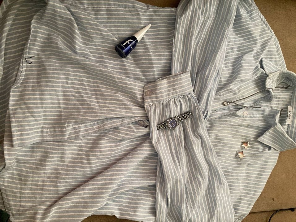Gri keten kumaştan, düğmeli ve yakalı kadın gömlek. Uzun kollu, midi boyda, rahat kesim, günlük sokak tarzına uygun.