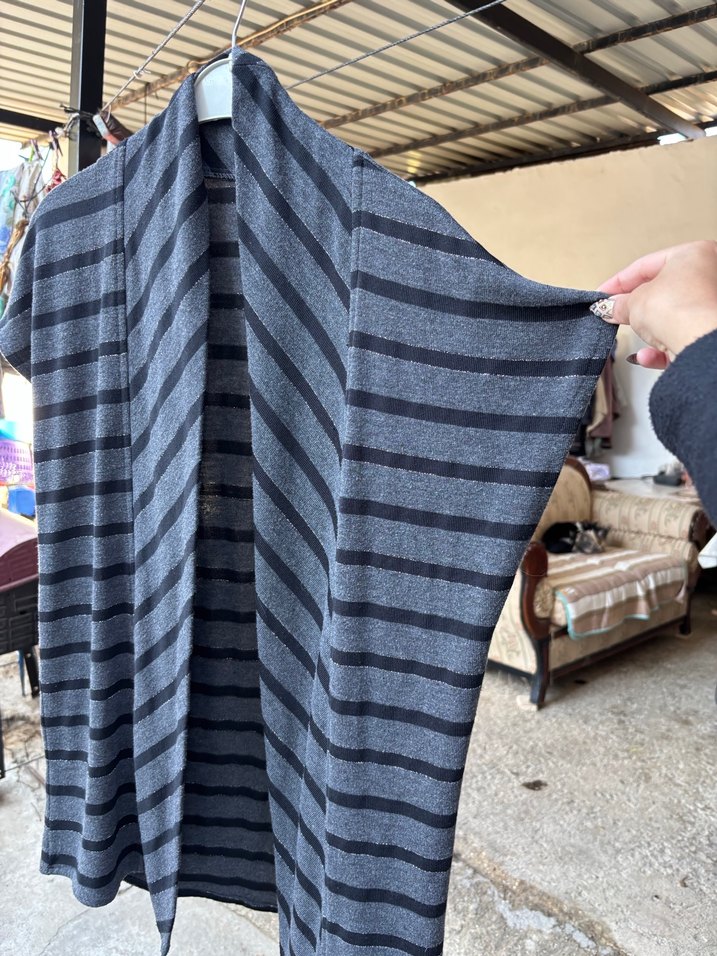 Gri çizgili kadın hırka, dökümlü ve bol kesimlidir. çizgilerinde ışıltı var marka temsili