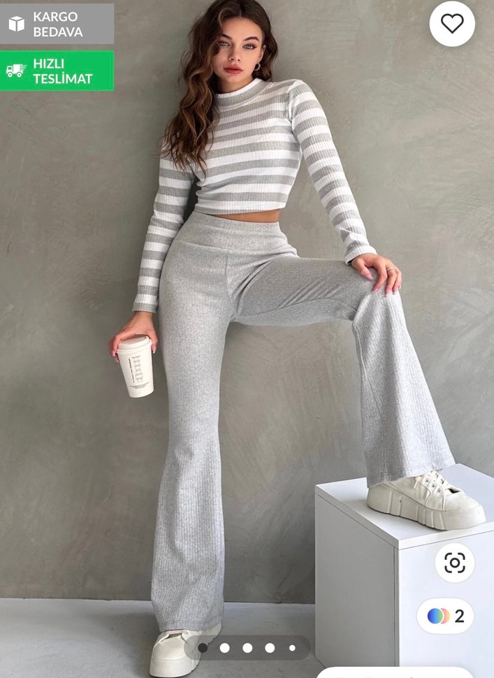 Gri çizgili, ispanyol paça kadın pantolon, yumuşak sentetik kumaştan, günlük kullanıma uygun şık ve rahat bir modeldir.