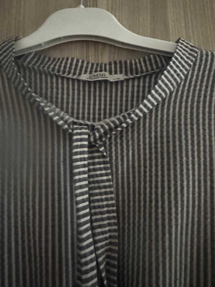 Gri çizgili keten kumaştan, pileli ve tekne yaka detaylı, uzun kollu kadın bluz. Rahat kesimiyle günlük kullanıma uygundur.