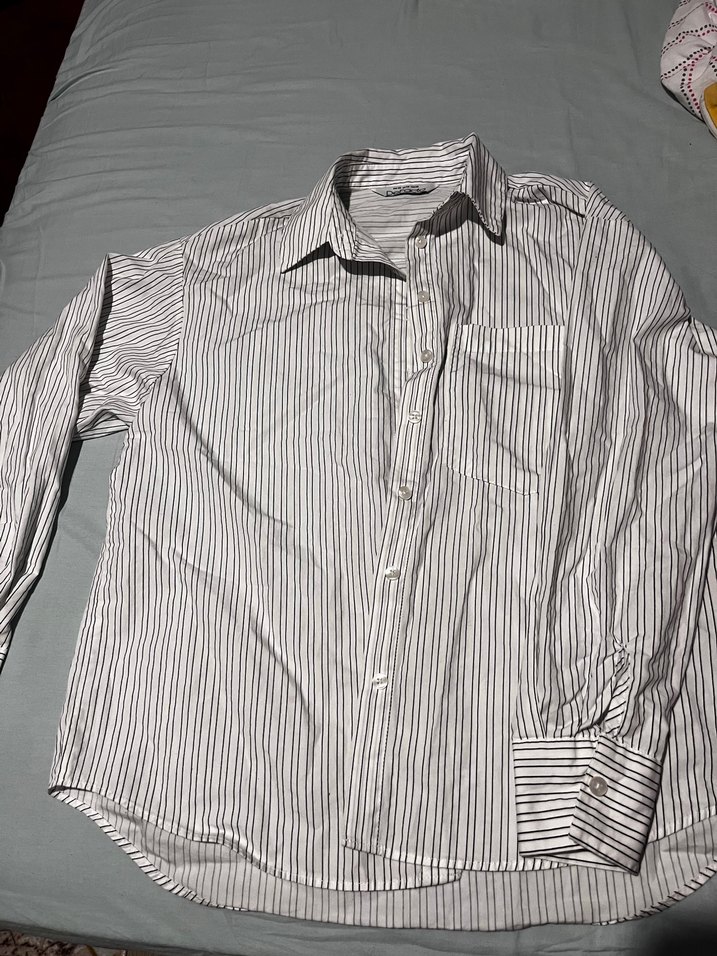 Uzun kollu, düğmeli, yakalı gri çizgili kadın keten gömlek. Oversize rahat kesimi ve nefes alan kumaşıyla günlük kullanıma uygun.