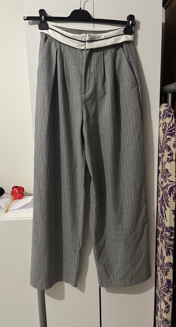 Gri keten kumaştan, çizgili ve pileli uzun paça kadın pantolon. Normcore tarzıyla ofis ortamına uygun, rahat kesim ve Paris tarzı casual görünüm sunar.