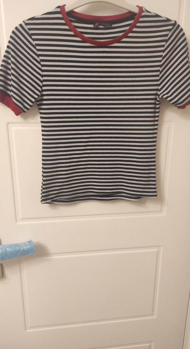 Gri çizgili, kısa kollu, tekne yaka ve fitted kesime sahip kadın tişörtü. Kırmızı kol uçlarıyla sokak stiline uygun, yumuşak dokulu kumaştan üretilmiştir.