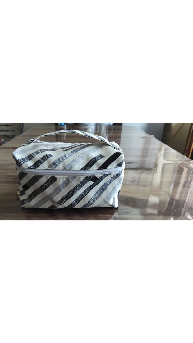 Gri çizgili, fermuarlı, su geçirmez duck kumaştan kadın makyaj çantası. Minimalist ve çağdaş tasarımıyla günlük kullanıma uygundur.