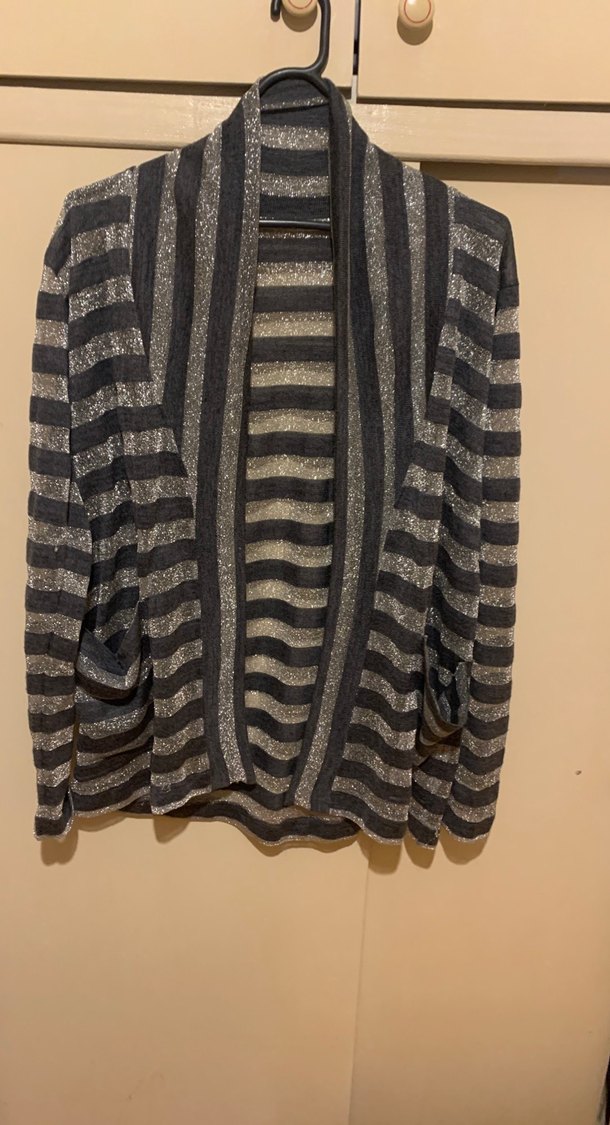 Gri tonlarda çizgili, pile detaylı, uzun kollu ve salaş kesim kadın midi hırka. Günlük kullanıma uygun, rahat ve şık.boy 73 cm iki kol arası 57 cm
