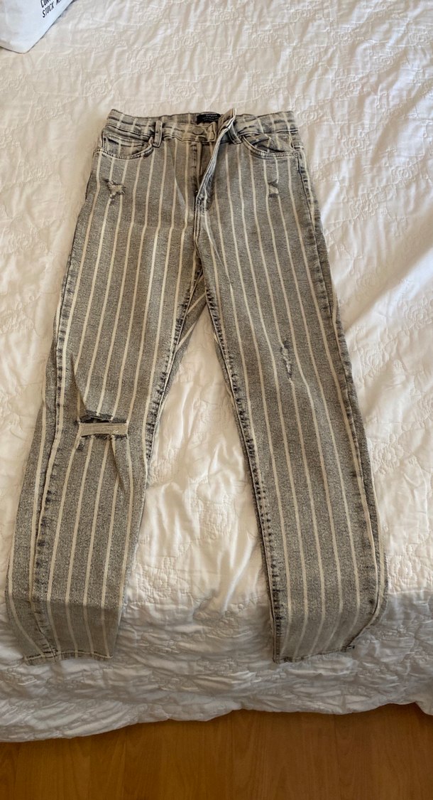 Gri renk, çizgili ve kemerli detaylara sahip, dar kesim midi kot pantolon. Günlük sokak stili için uygundur.