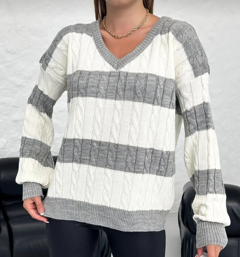 Gri ve beyaz çizgili, V yaka, uzun kollu, örgü kadın kazak. Rahat ve günlük kullanıma uygun. Standart Beden