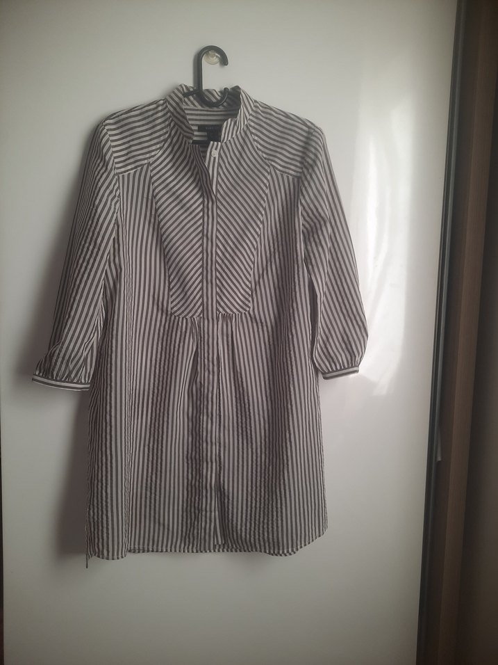 Pamuk kumaştan yapılmış, uzun kollu, düğmeli ve çizgili desenli gri gömlek. Ofis ve günlük kullanıma uygundur.