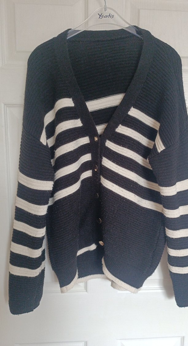 siyah ve beyaz çizgili, uzun kollu, notluk yakalı, bol kesim triko hırka. Midi boy ve rahat kullanıma uygun.
