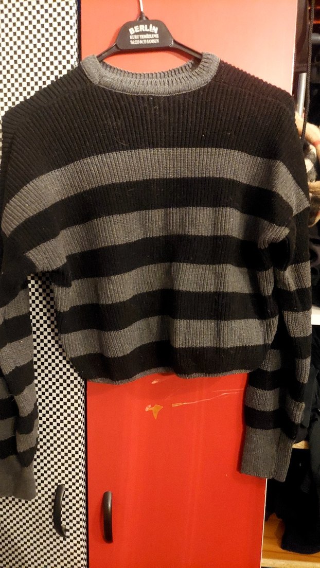 Uzun kollu, kruvaze yaka ve çizgili gri-siyah renklerde, triko kumaştan yapılmış, vücuda oturan kadın kazak.