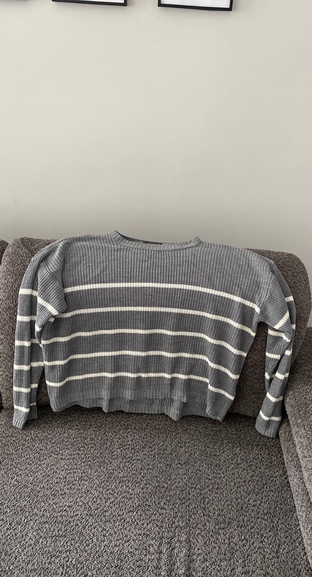 Gri renkli, çizgili, uzun kollu ve kayık yaka triko kadın kazak. Yumuşak yün malzemeden, bol kesim ve normal boyda, günlük kullanıma uygun.