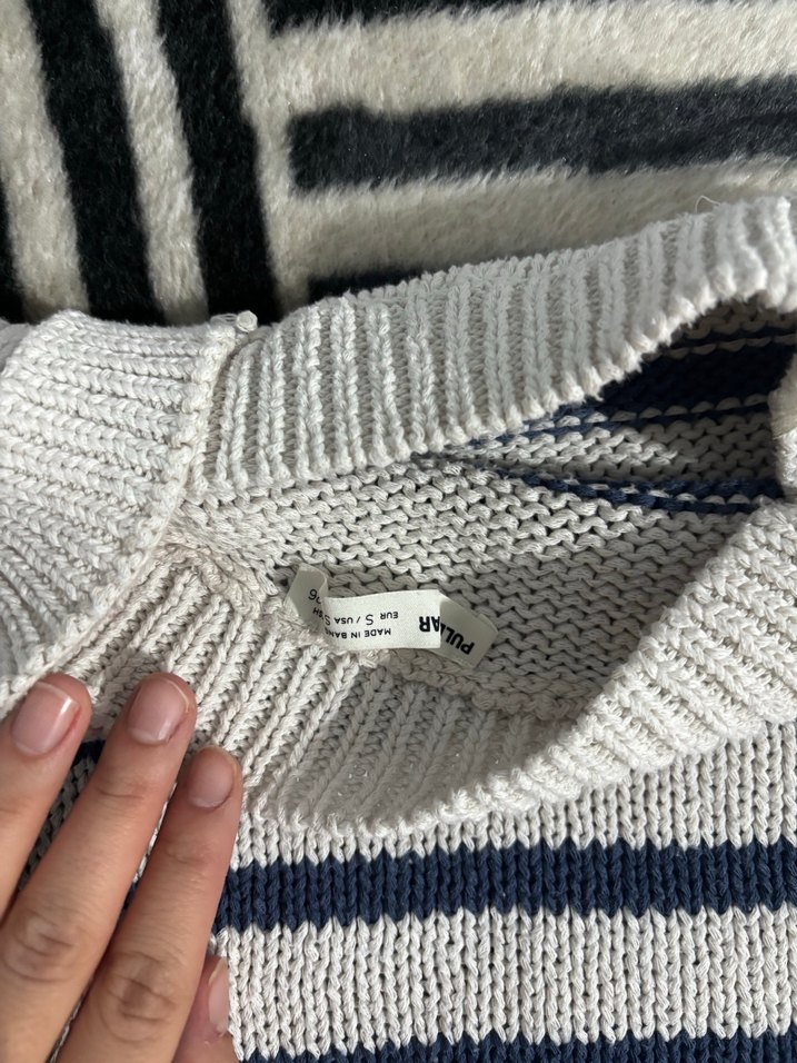 Gri renkli, çizgili desenli kadın triko kazak. Uzun kollu, yuvarlak yaka ve bol kesimdir. Rahat ve yumuşak dokulu triko kumaştan yapılmıştır.