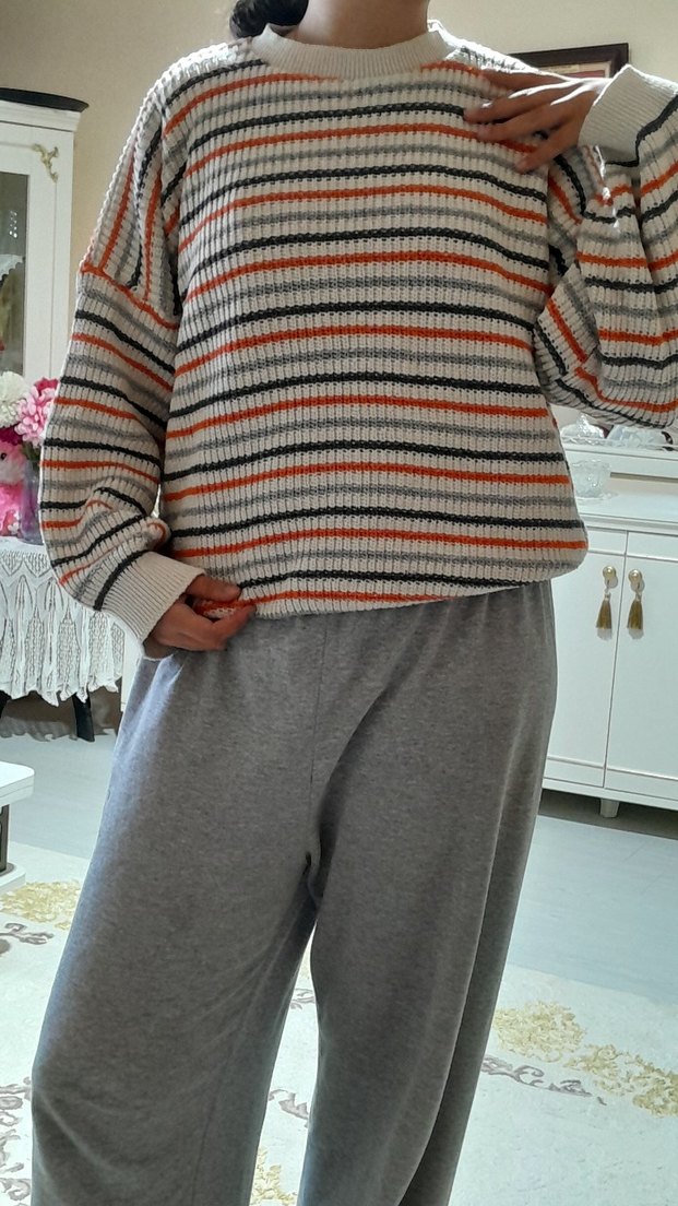 Gri tonlarında çizgili, uzun kollu, yuvarlak yaka, rahat kesim kadın triko kazak. Günlük kullanıma uygundur.
