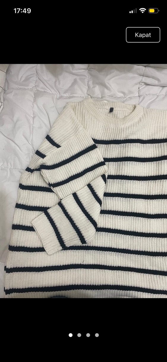 Gri ve beyaz çizgili, yuvarlak yaka ve uzun kollu, rahat kesim kadın triko kazak. Orta uzunlukta, günlük rahat sokak stili için uygun.