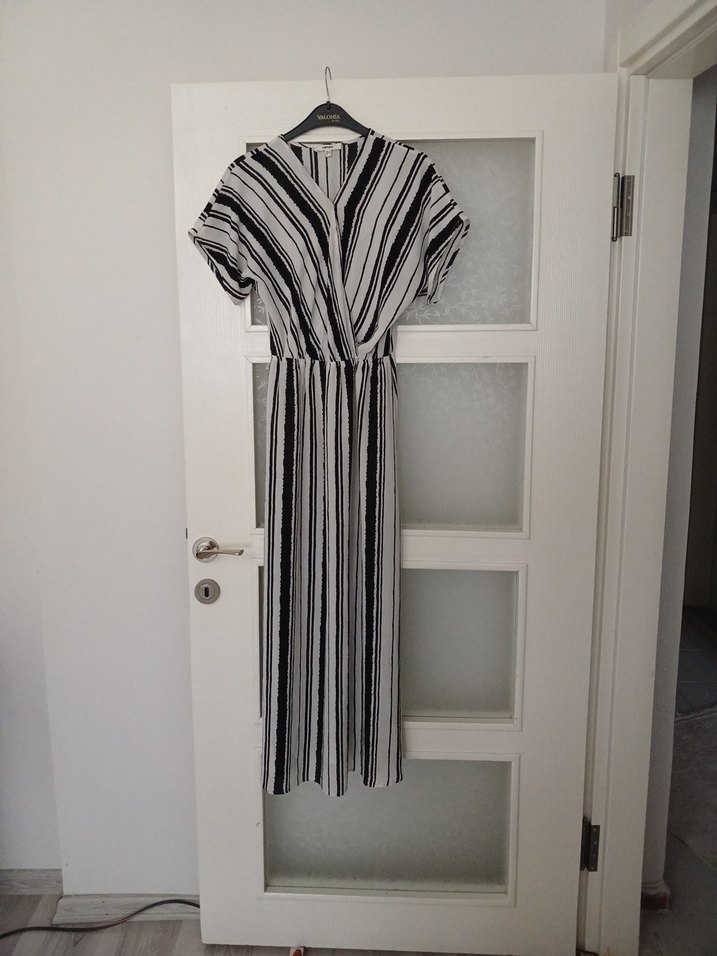Gri çizgili kadın tulum, kısa kollu, V yakalı ve pileli sentetik kumaştan, rahat kesimle günlük kullanım için uygun.
