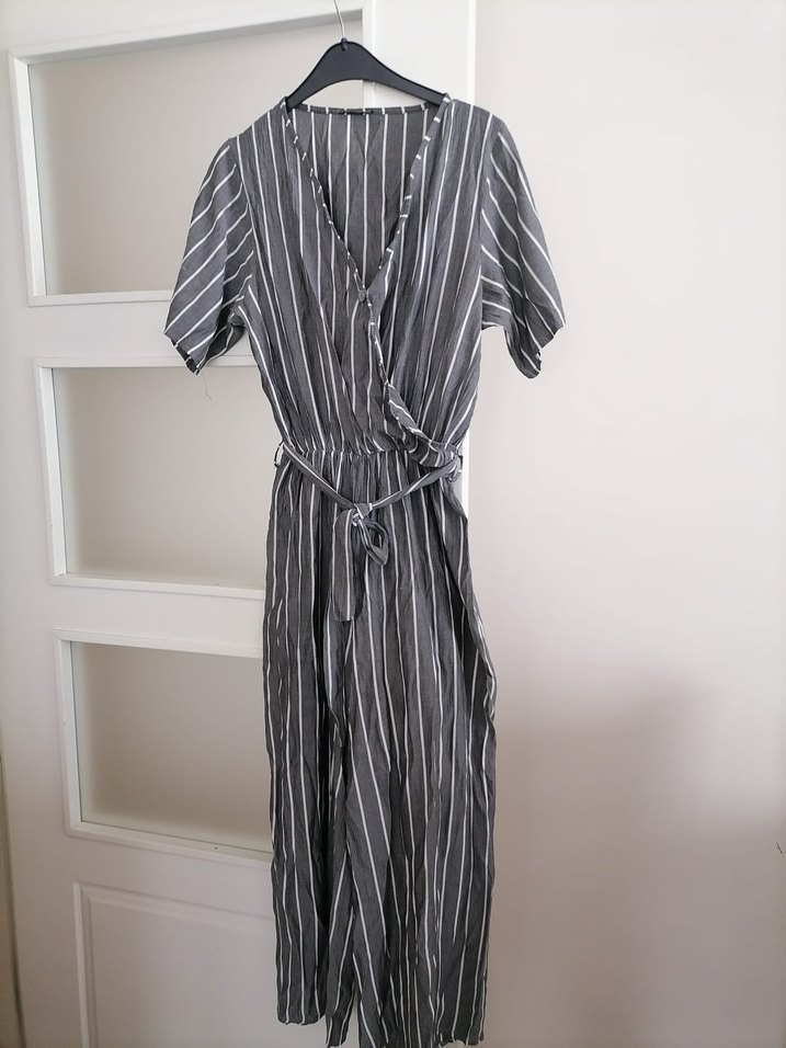 Kadınlar için gri çizgili, kısa kollu, V yakalı, bol kesim uzun tulum. Sentetik kumaştan, pile detaylı, günlük rahat stil için uygun.