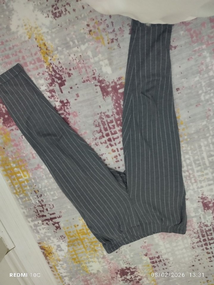 Gri çizgili kumaştan, regular fit ve pileli tasarıma sahip, günlük rahat kullanıma uygun midi boy eşofman Sentetik kumaştan üretilmiştir.