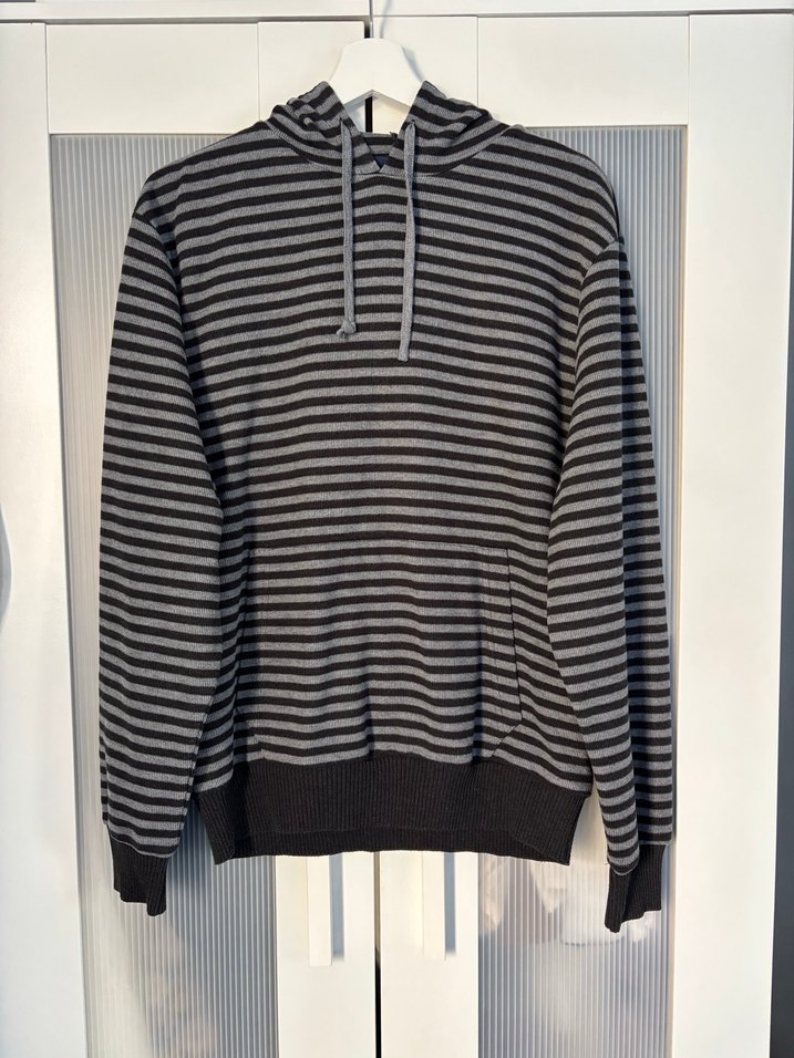 Uzun kollu, kapüşonlu ve bol kesimli kadın sweatshirtü, yumuşak ve sıcak dokulu örgü kumaştan üretilmiştir. Gri çizgili tasarımıyla rahat bir sokak stili sunar.