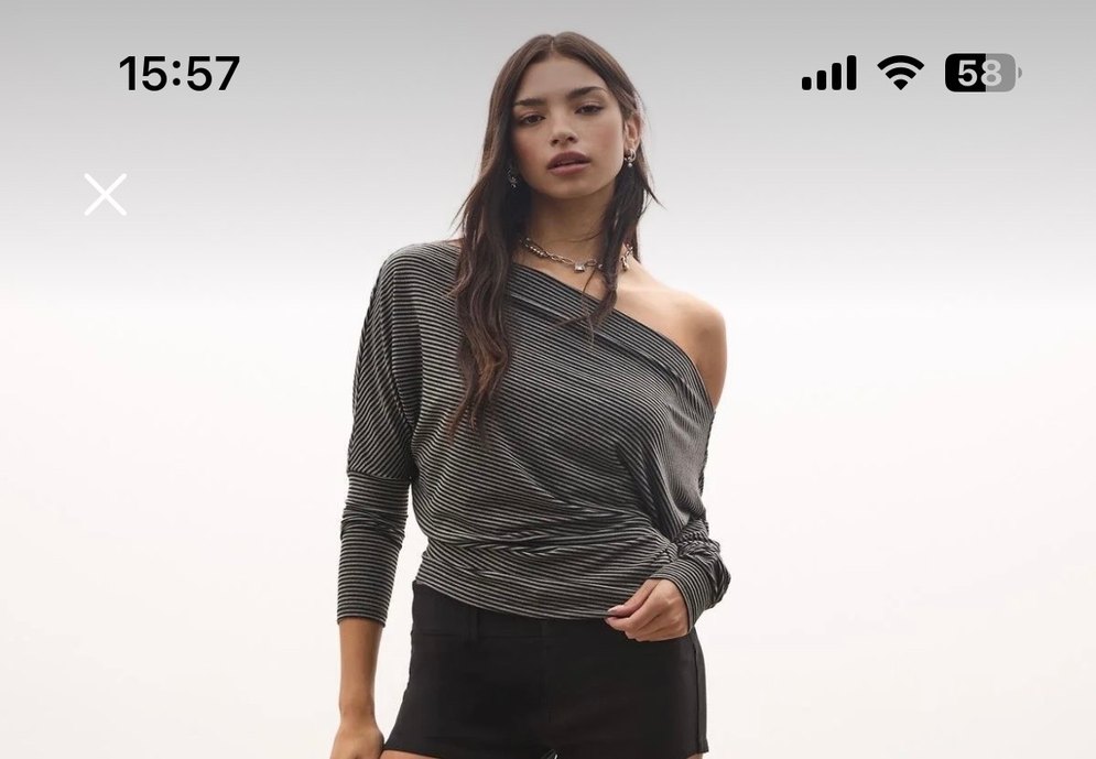 Kayık yaka, uzun kollu, gevşek kesim gri çizgili, ipeksi dokulu kadın bluz. Günlük sokak stiline uygun rahat bir model.