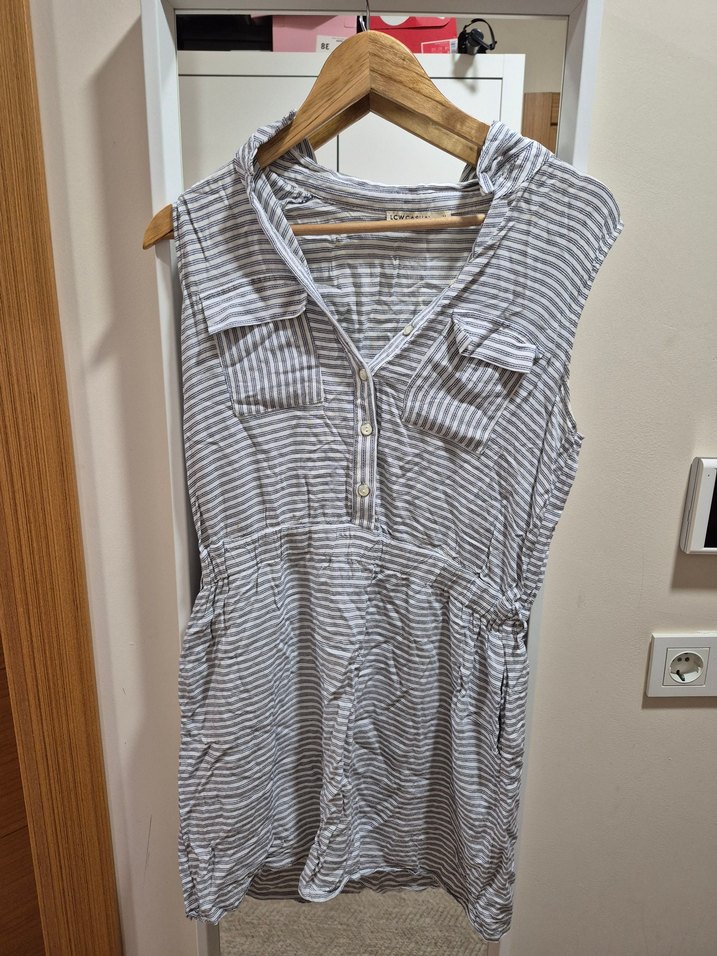 Gri çizgili keten kumaştan, düğmeli ve yakalı, kolsuz elbise. Rahat kullanım için midi boy ve bol kesim. lcw marka m beden.