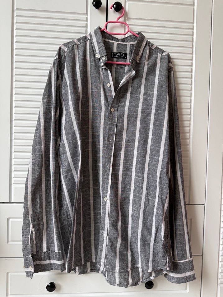 Gömlek, keten kumaştan üretilmiş, uzun kollu ve düğmeli. Geniş kesimi ve çizgili deseni ile rahat bir günlük stil sunar.