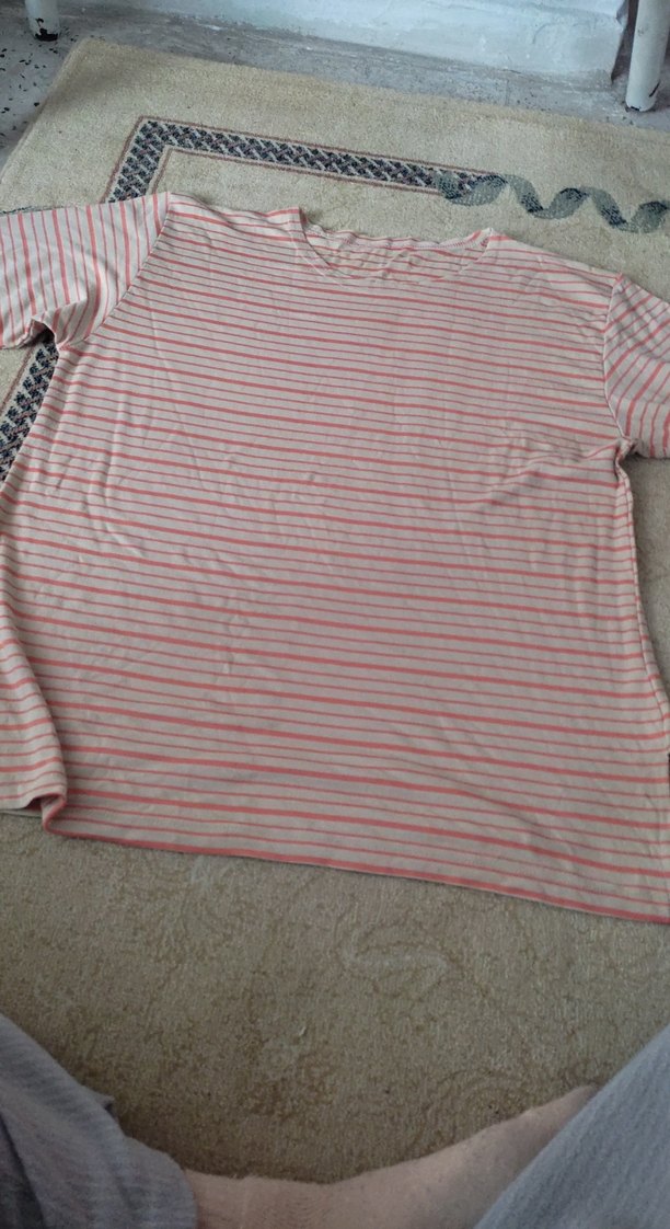 Gri ve pembe çizgili, keten kumaştan yapılmış, salaş kesim, kısa kollu, kayık yaka hamile tişörtü. Günlük rahat kullanıma uygundur.