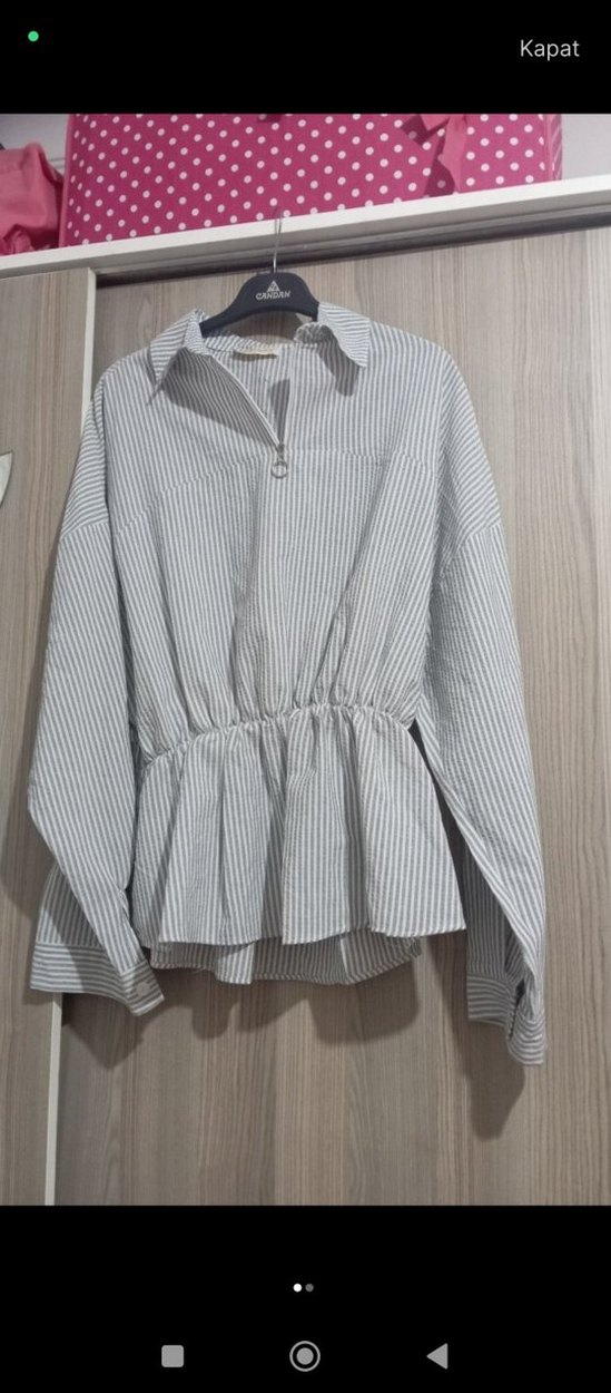 Gri çizgili keten kumaştan, uzun kollu, yakalı ve pileli detaylı, bol kesim belden büzgülü kadın gömlek. Rahat ve şık sokak stili için uygun.