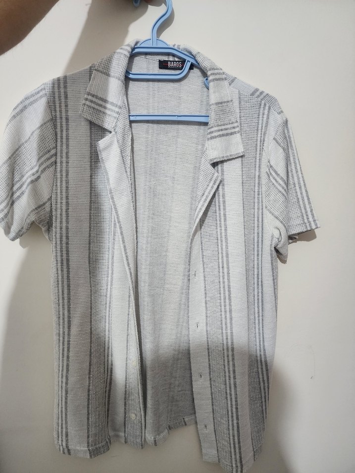 Keten kumaştan, kısa kollu, düğmeli ve gri çizgili rahat kesim