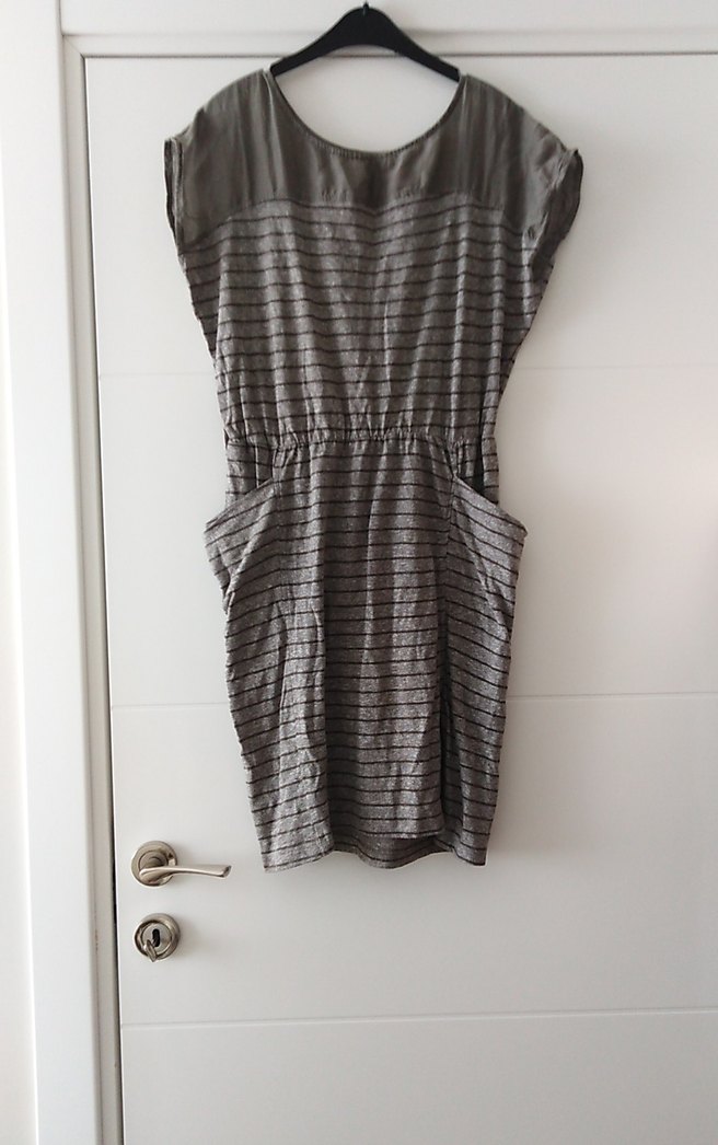 Gri çizgili keten midi elbise, kolsuz ve bol kesimdir. Kayık yaka ve drapeli tasarımıyla minimalist, bohem tarzı sunar. Yan ceplidir.Birkaç kez giyildi.Çok fazla kusuru yoktur belli değil giyilebilir durumda detayları fotoğrafta paylaşılmıştır iadeye sıcak bakmıyorum.