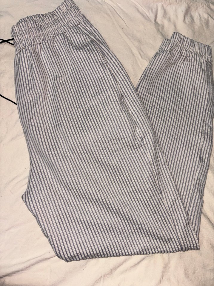 Gri çizgili keten kumaştan, pile detaylı, bol kesim midi pantolon. Günlük rahat ve şık sokak stili için uygundur.