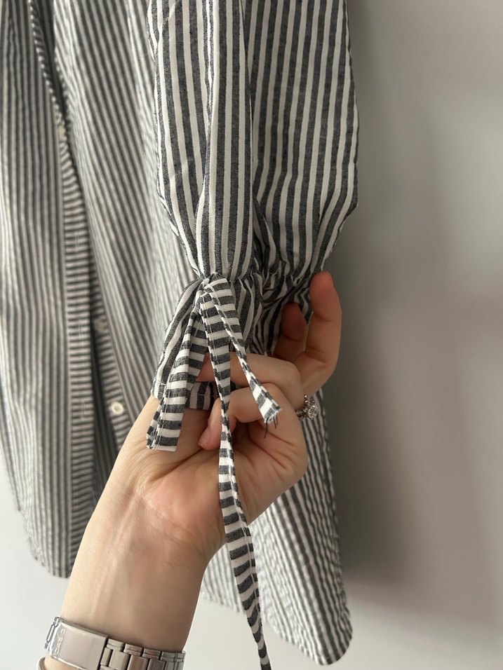 Gri çizgili keten gömlek, kayık yaka ve bağcıklı askılı kollara sahiptir. Salaş kesimiyle günlük şıklık sunar. 1 kere giyildi