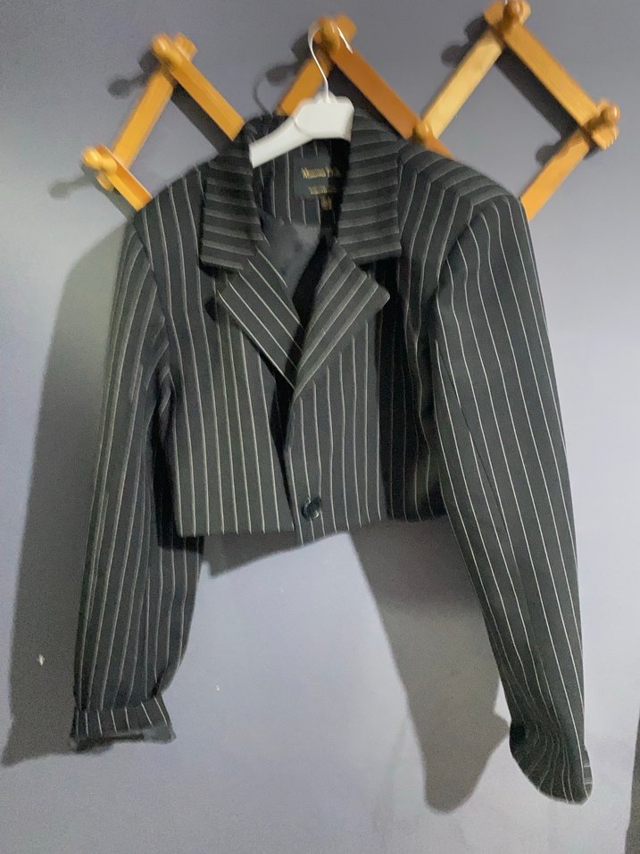Gri çizgili, kısa kesim kadın blazer ceket. Yaka detaylı ve düğmeli, uzun kollu, ofis için uygun rahat kesim. Sentetik kumaştan üretilmiştir.