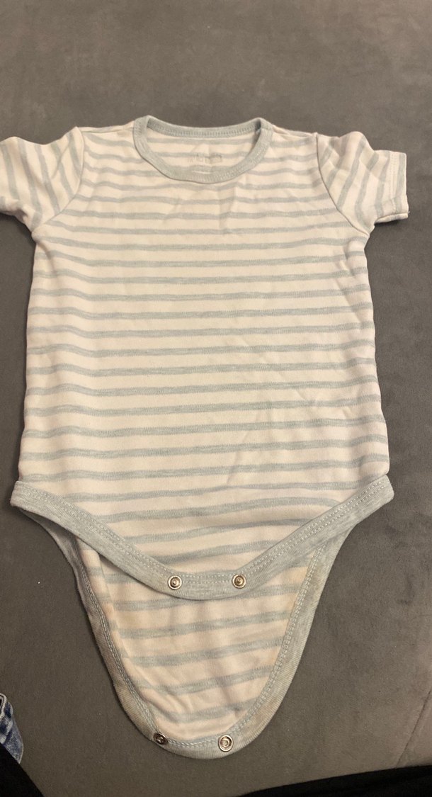 Gri çizgili, kısa kollu, yuvarlak yakalı ve düğmeli bebek body. Yumuşak pamuklu kumaştan üretilmiştir.