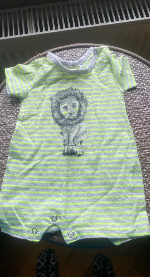 Gri ve sarı çizgili, kısa kollu bebek tulumu. Önde aslan baskısı, yumuşak sentetik kumaş ve yuvarlak yaka ile örülüdür.