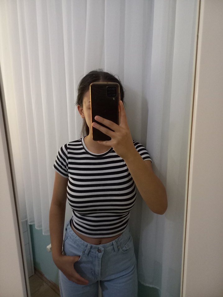 Fitted kesim, kısa kollu ve yüksek yakalı crop. çizgili denim kumaştan, günlük rahat stil için uygundur.