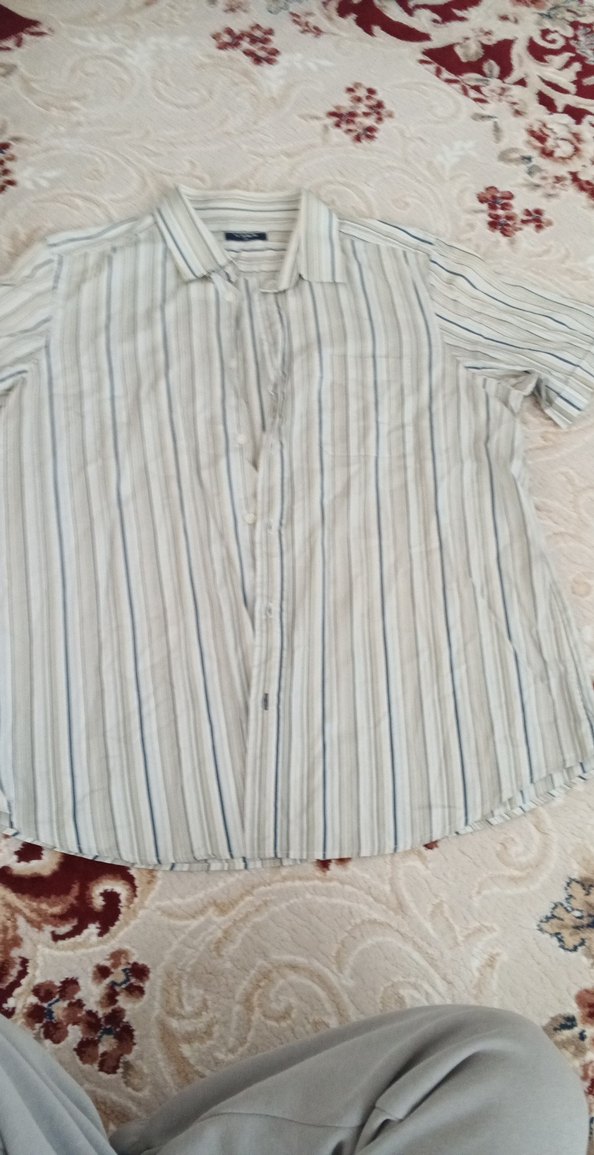Kısa kollu, yakalı ve düğmeli ön yapıya sahip erkek gömleği. Nefes alabilir keten kumaştan, bol kesim ve gri çizgili desende, günlük rahat stil için uygun.