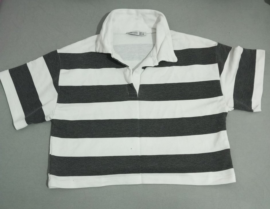 Fulla moda Gri ve beyaz çizgili, kısa kollu, düğmeli erkek polo tişört, rahat kesimi ve yumuşak sentetik kumaşıyla günlük sokak stili için uygundur.