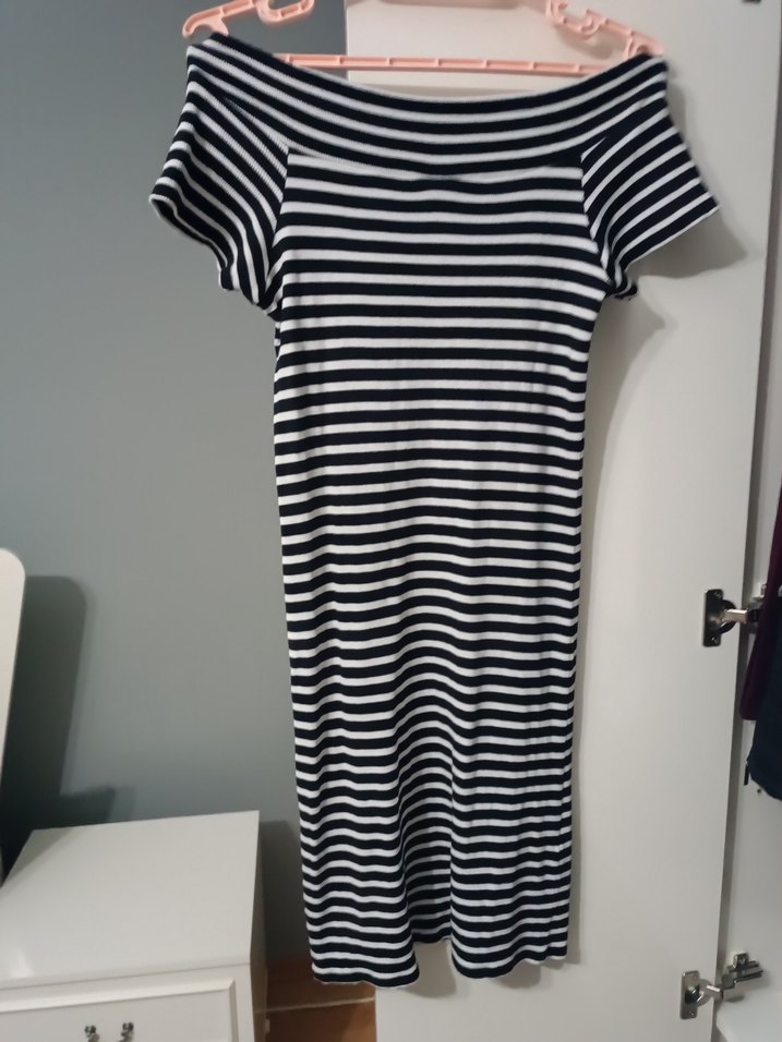 Bu vücuda oturan midi elbise, tekne yaka ve kısa kollu olup, yumuşak sentetik kumaştan üretilmiştir. Çizgili deseni ve pile detaylarıyla günlük şıklık sunar.