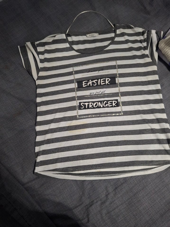 Gri çizgili, kısa kollu, yuvarlak yakalı tişört. Önünde "EASIER STRONGER" baskısı ve esnek yapısı vardır. Rahat ve günlük kullanım için uygundur. ön tarafında sarı bir leke var çıkarmak için uğraşmadım çıkar mı bilmiyorum
