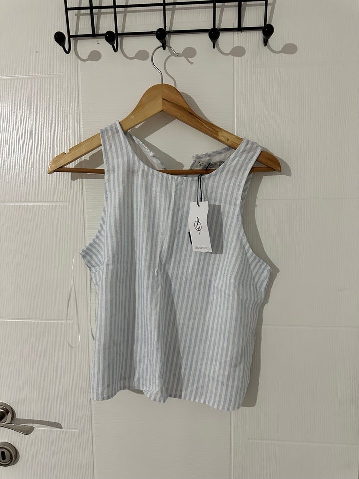 Kolsuz ve regular fit kadın üst. Keten kumaştan üretilmiş, çizgili desenli ve günlük kullanıma uygun rahat bir model.