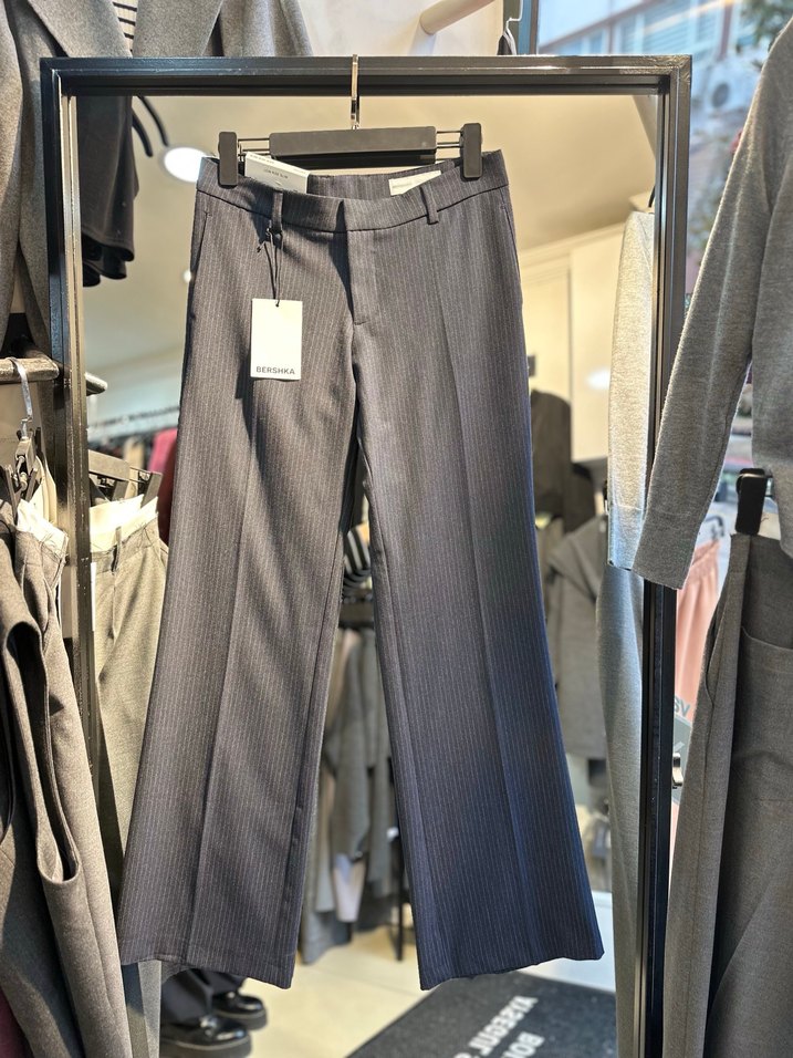 Gri çizgili kumaştan, kemerli, normal boy midi uzunluğunda, regular fit kadın pantolon.