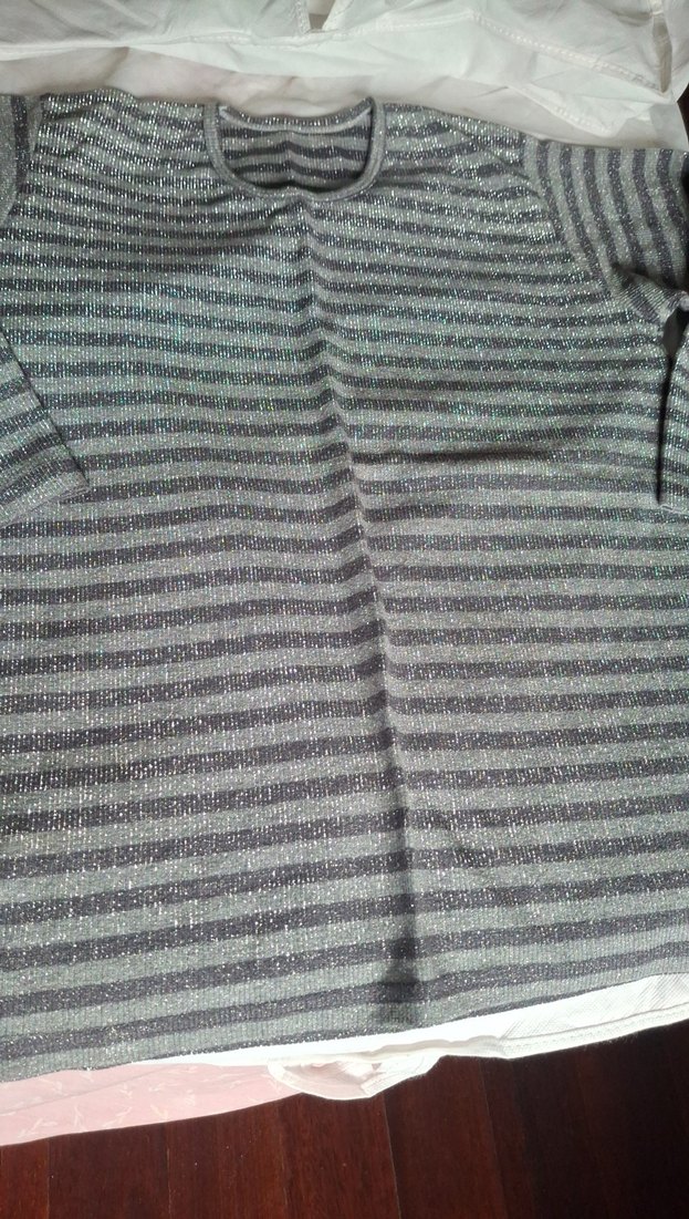 Gri çizgili kadın triko kazak, yuvarlak yaka ve uzun kolludur. Rahat, bol kesimi,Gece ve gündelik kullanıma uygundur. İki kol altı 55 cm boyu;70 cm. Xl-Xcl-3 xl.Açık gri sinden.Sheer Glitte simli Pantolon Çorabı da mevcuttur.