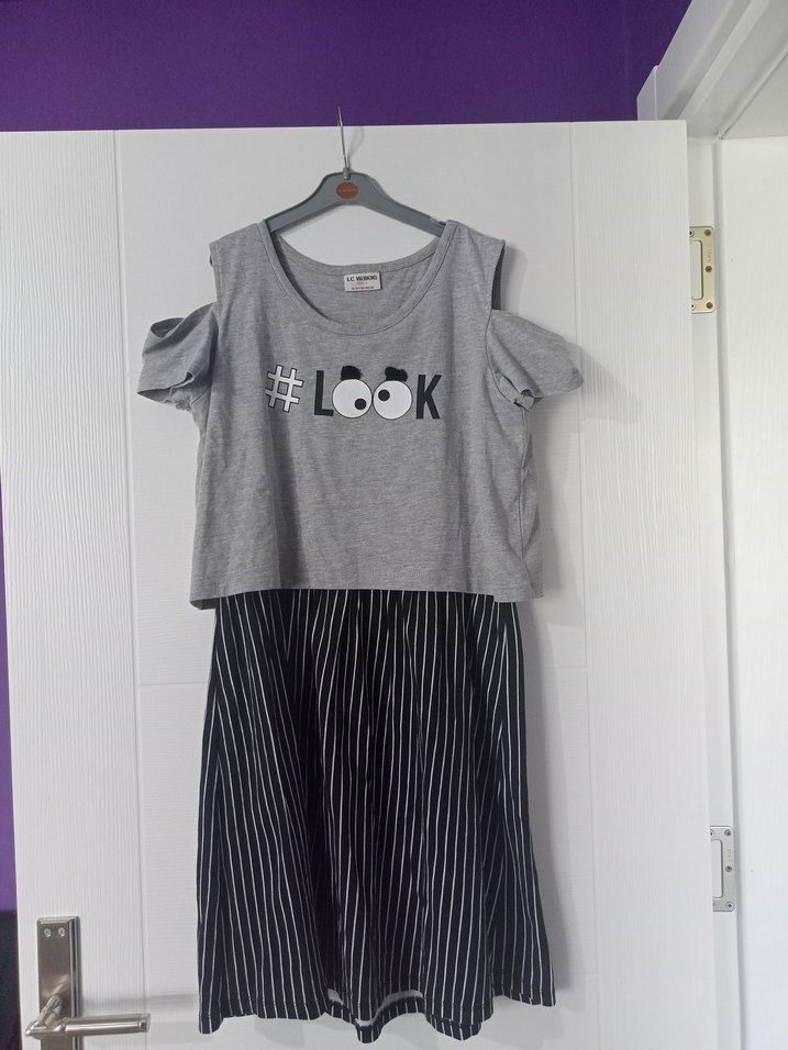 Gri pamuklu kumaştan, cm si ve yaşı resimlerde bulunan üstü gri omzu açık kol detayına sahip, çizgili pileli eteği olan rahat kız elbisesi. Günlük kullanıma uygundur. Önünde "LOOK" yazısı bulunur. Herhangi bi kusuru yoktur fiyat için teklif verebilirsiniz yardımcı olmaya çalışırım