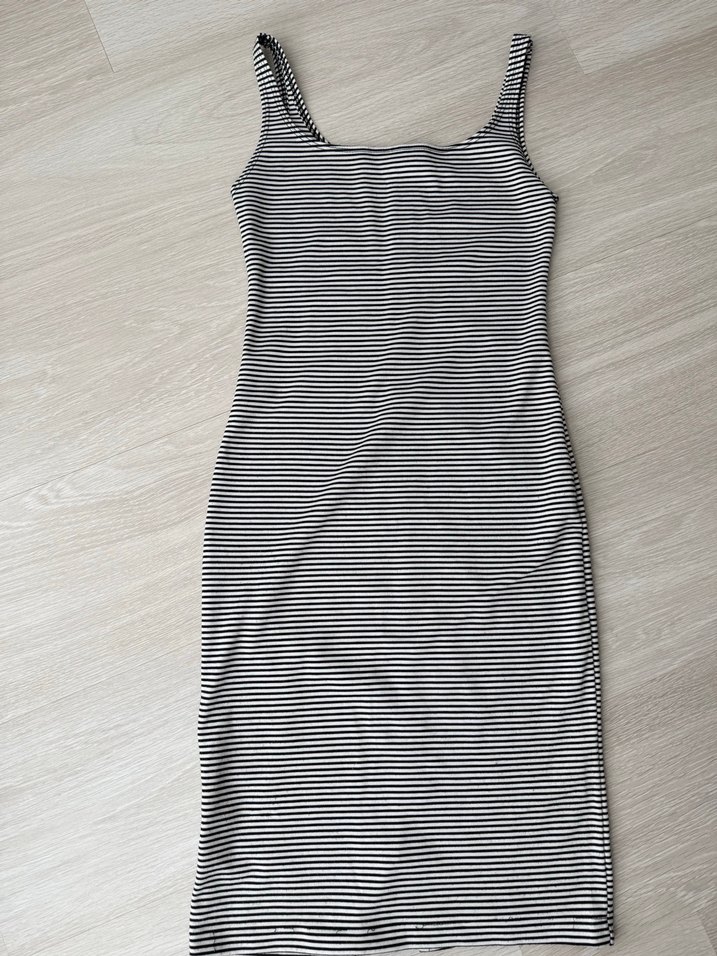 Gri çizgili, kolsuz midi elbise, tekne yaka ve dar kesim. Yumuşak sentetik kumaştan, pilili detaylı, günlük sokak stiline uygun.