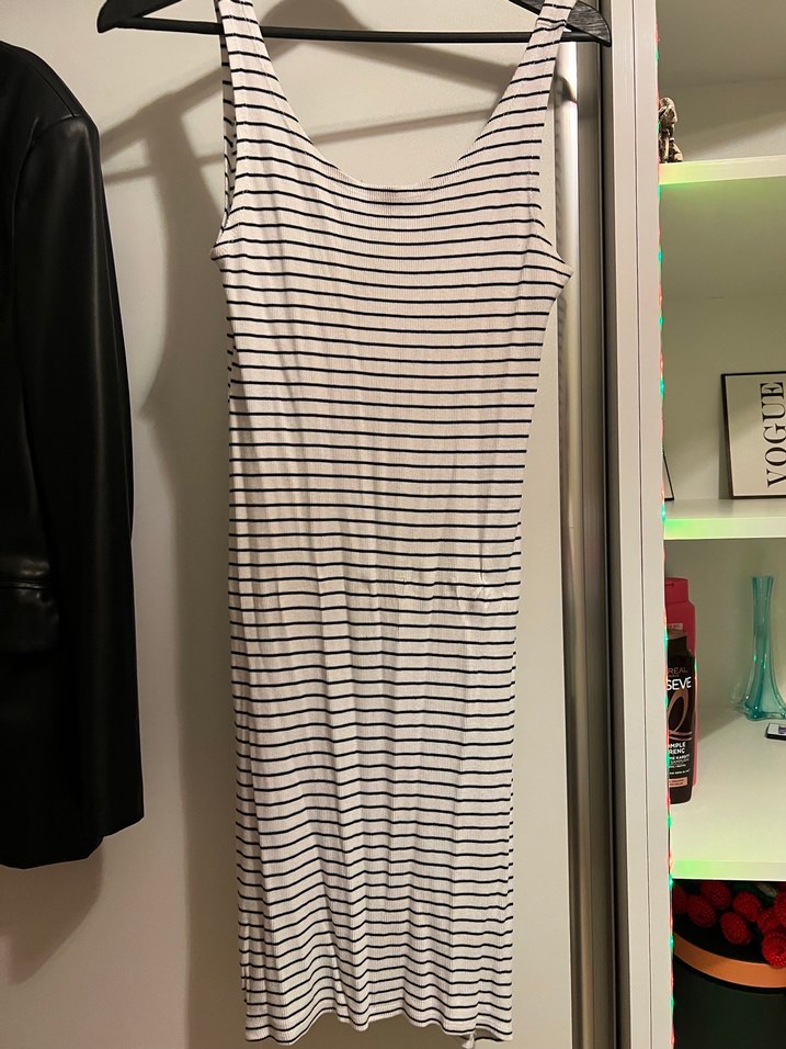 Siyah çizgili, beyaz zeminli, kolsuz midi elbise. Teknolojik sentetik kumaştan, tekne yaka ve vücuda oturan kesime sahip, rahat sokak stiline uygun.Deformesi mevcut değildir.