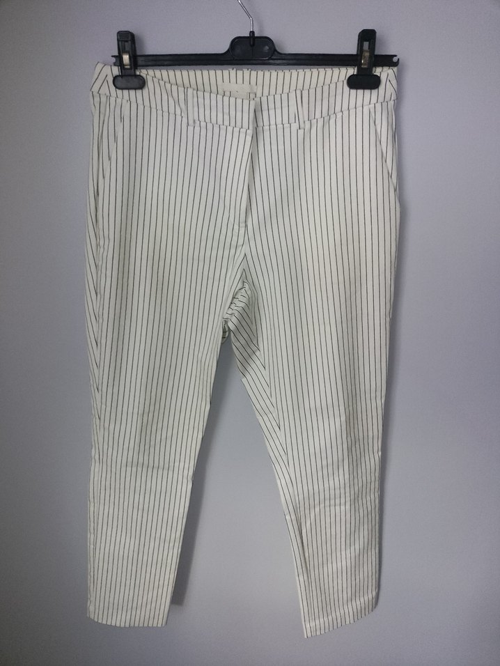 Gri çizgili, midi boy, regular fit kadın pantolon. Beyaz sentetik kumaş ve pile detaylarıyla ofis kullanımı için uygundur.