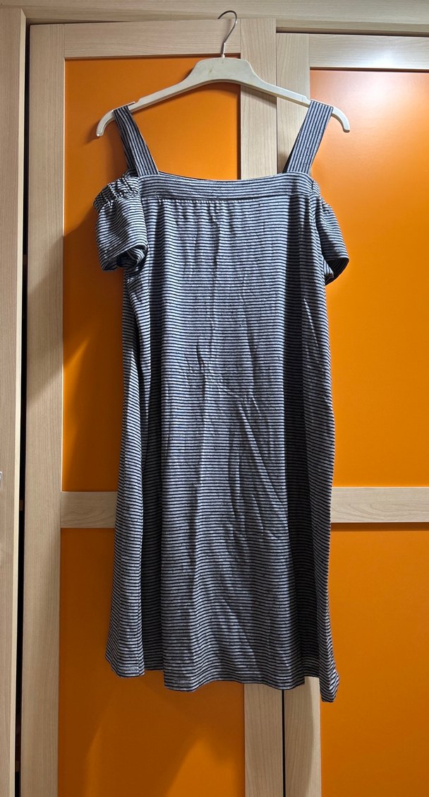 Gri midi elbise, kısa kollu ve kayık yaka detaylıdır. Pilili tasarımı ve çizgili deseniyle rahat ve şık bir görünüm sunar.