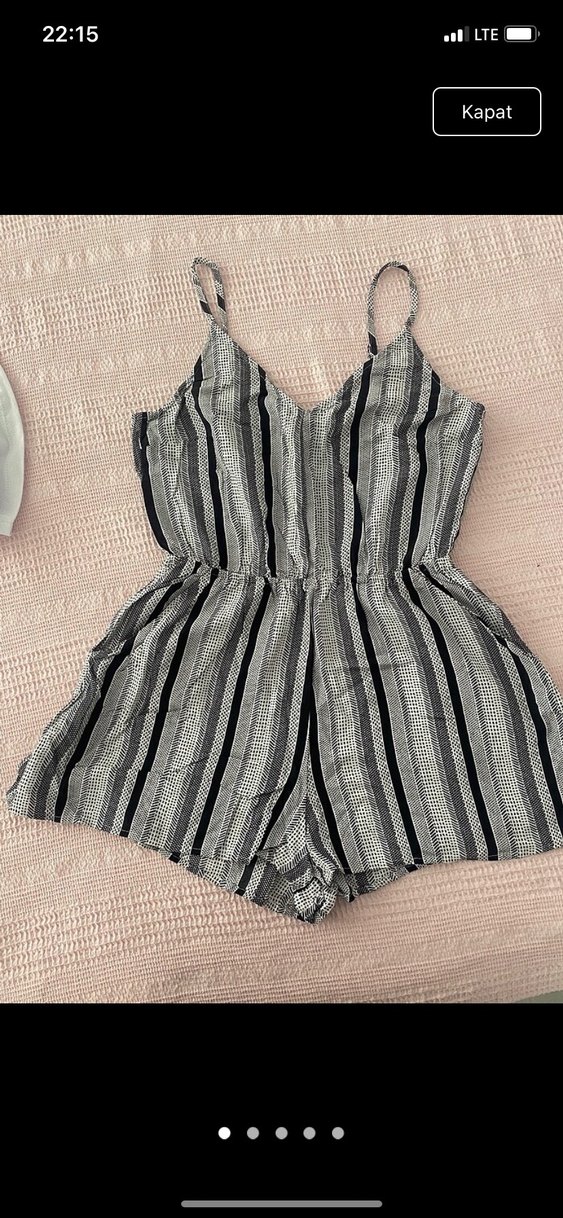 Gri renkli, çizgili kısa tulum, askılı ve V yakalıdır. Pilili detayları ve ince askılarıyla şık ve rahat bir sokak stili sunar.