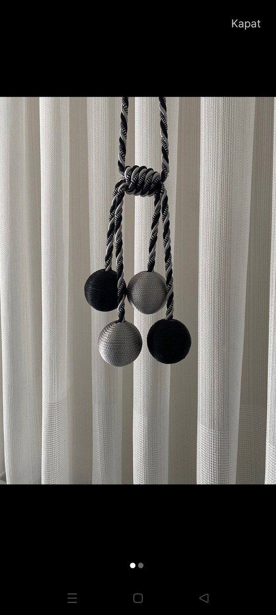 Modern gri perde bağı, siyah ve gri çizgili dokulu toplarla süslenmiştir. Perdeler için zarif bir dekoratif dokunuş sağlar. bir adet fiyatı dört adet vardir